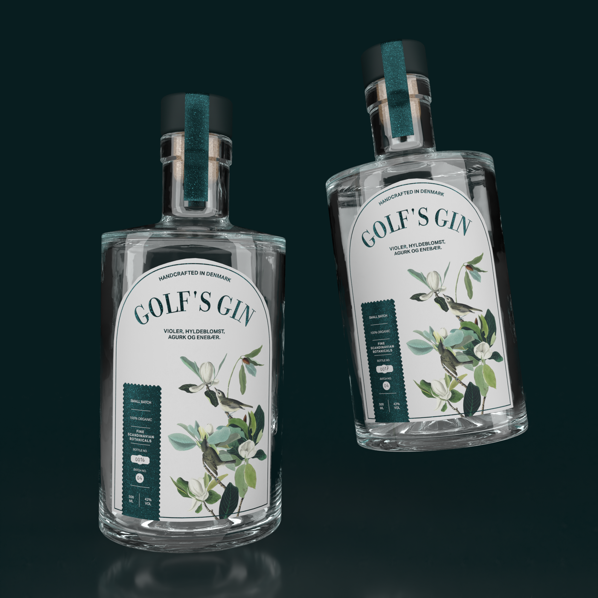 A design for a Scandinavian Gin. The client wanted โa brand-new label for our latest Golf's Gin batch. We need a design that looks very elegant and very high-end. The bottle is a clear glass bottle with a cork closure and a black top. The sport โgolfโ has nothing to do with this gin. It is just a last name.โ