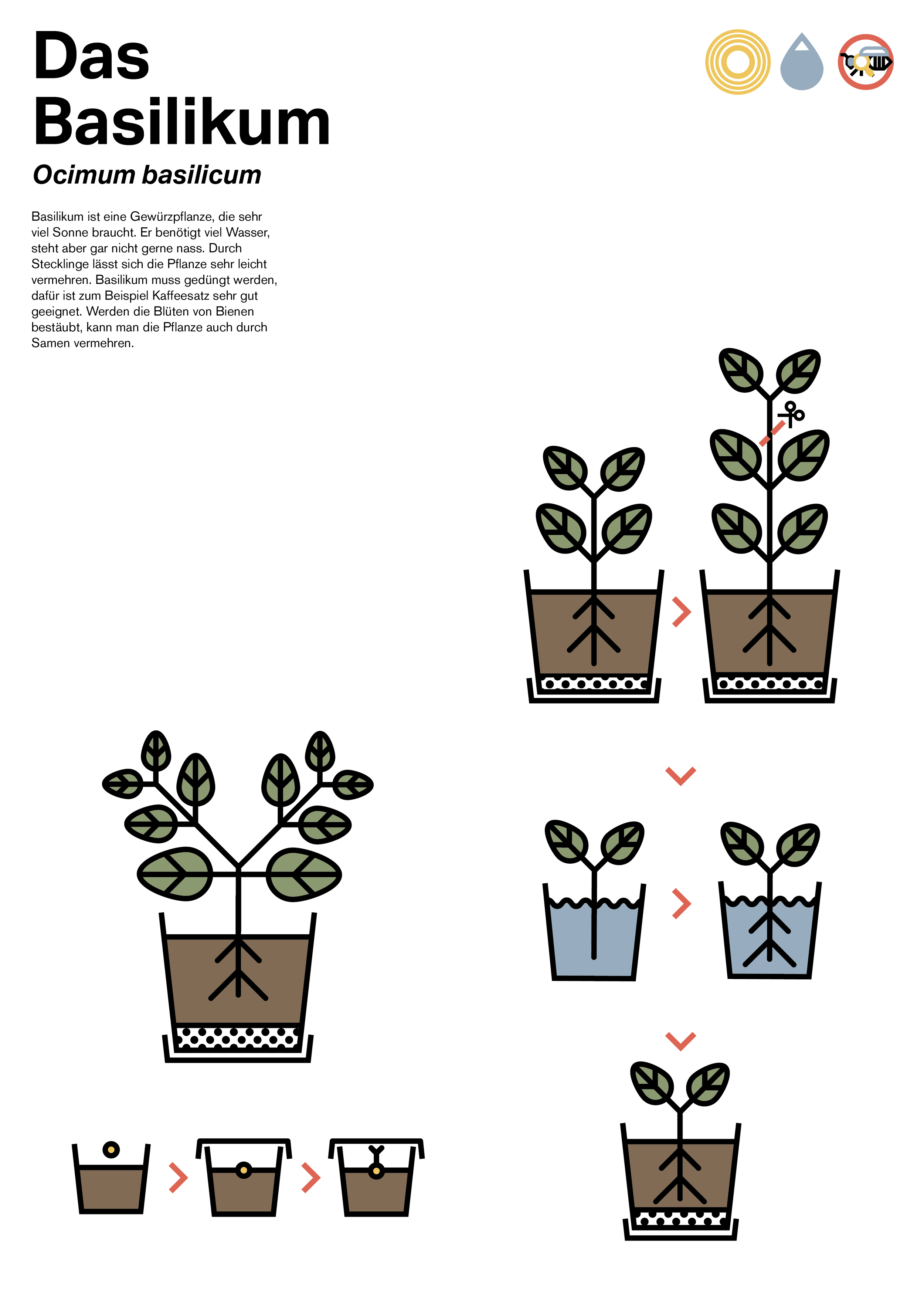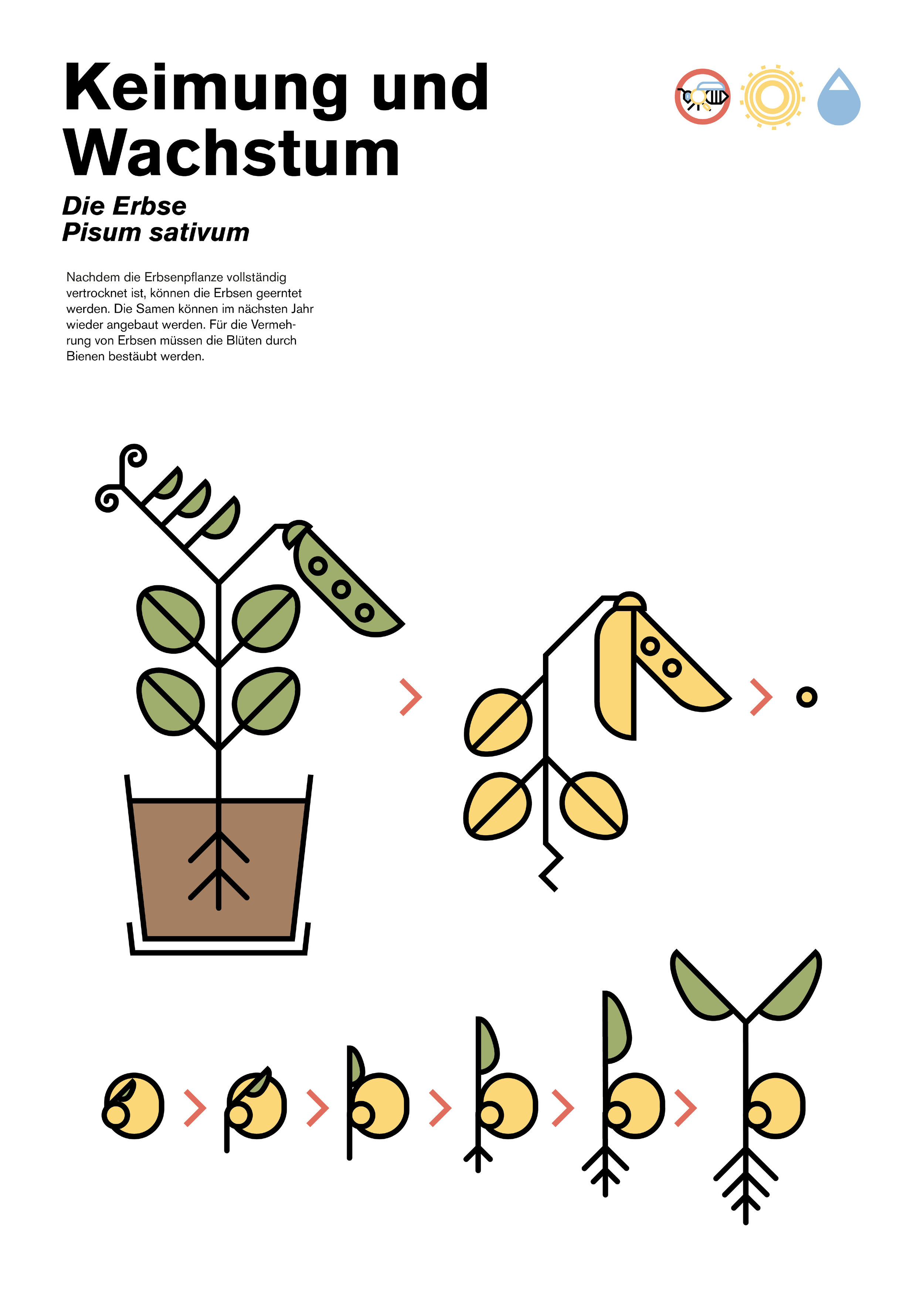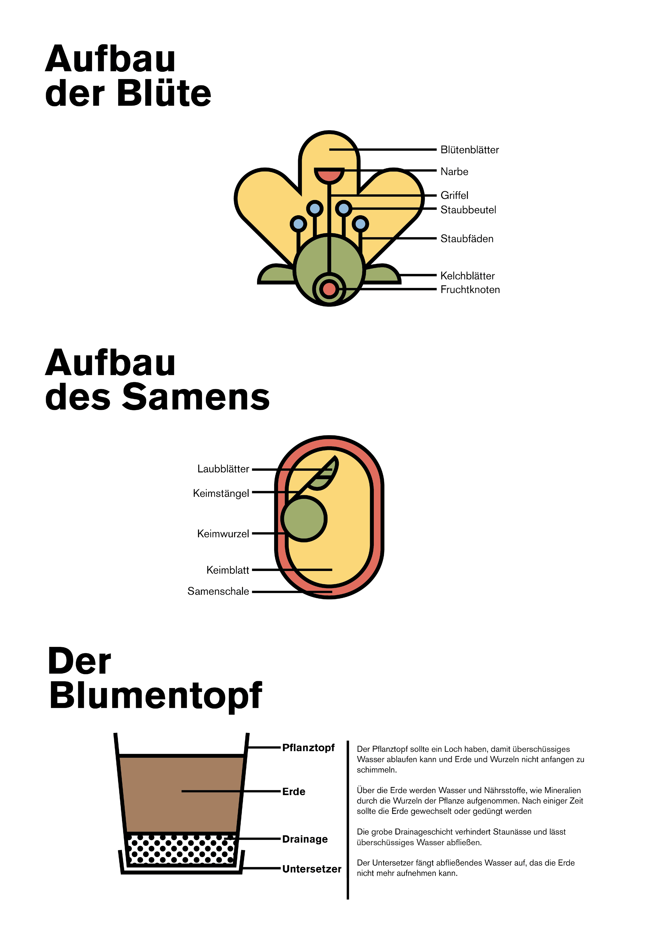 The student then proves with her own graphic representations in the practical part of the work that the communication of basic horticultural knowledge can also succeed with less attention to detail, but instead with functional, yet decorative abstraction. The posters she designed offer easy-to-understand instructions for handling specific plants and explain organic processes such as photosynthesis or germination.