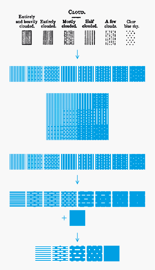 The previously (in the thesis) analyzed design concept of Galton serves as an inspiration for efficient use of space in visual communication. Much data is represented graphically in a small place. Additionally, the application possibilities are versatile—on the one hand, the system can be used to cover the entire area of a map, on the other hand, the individual sections can stand on their own, representing isolated locations, like Galton already did. This is a convenient basis for revising his ideas in light of Edward Tufte’s “graphical excellence”. The primary motivation to redesign this approach is that it takes the data from forecasts and converts tables of numerical values into graphics using little space yet remaining visually comprehensible. To express the aim of the prototype, some points from Tufte’s list shall be repeated: it is aimed to show the data—without distorting or distracting it, present many numbers in a small space and make large data sets coherent, encourage the reader to compare different pieces of data, giving different levels of detail from fine structure to broad overview.